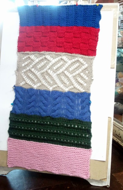 Six stripes of acrylic in six randomly chosen patterns, now happily adorning a sandwich board at work (not its intended purpose, granted, but a sufficient substitute). If you saw it in person, you would also see that the purple and beige stripes in the middle can double as a (very deliberate) example of why one should never try to steam block acrylic! :)